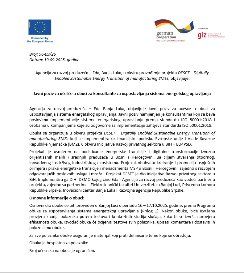 Eda – Agencija za razvoj preduzeća je objavila Javni poziv za učešće u obuci za uspostavljanje sistema energetskog upravljanja. Obuka […]
