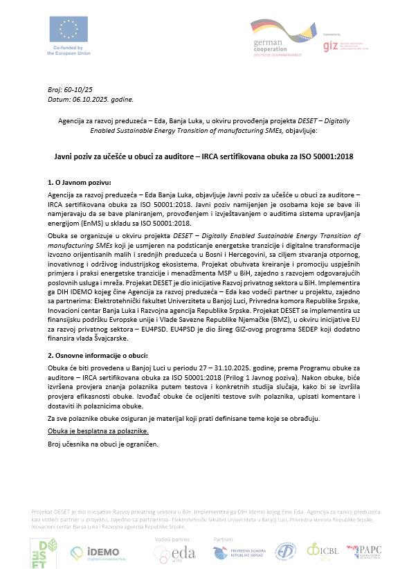 Obuka se organizuje u okviru projekta DESET – Digitally Enabled Sustainable Energy Transition of manufacturing SMEs, koji se implementira uz podršku Evropske unije i Vlade Savezne Republike Njemačke (BMZ), u okviru inicijative EU4PSD – Razvoj privatnog sektora u BiH.