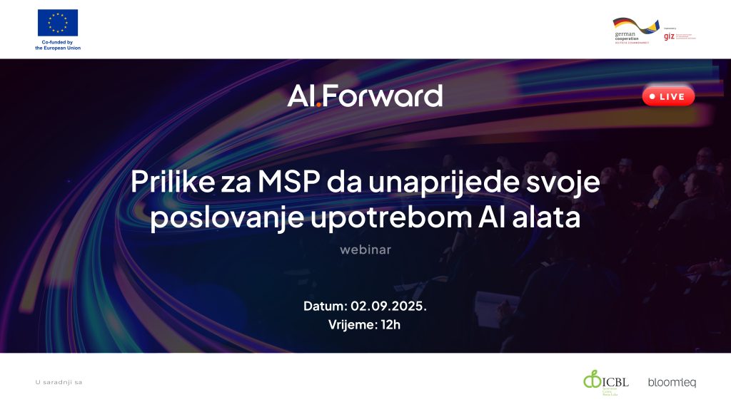 Pozivamo vas da se pridružite webinaru u okviru projekta AI FORWARD, posvećenom mogućnostima primjene vještačke inteligencije (AI) u poslovanju mikro, malih i srednjih preduzeća u Bosni i Hercegovini. Poseban fokus stavljen je na firme koje vode žene i izvozno orijentisana preduzeća.
